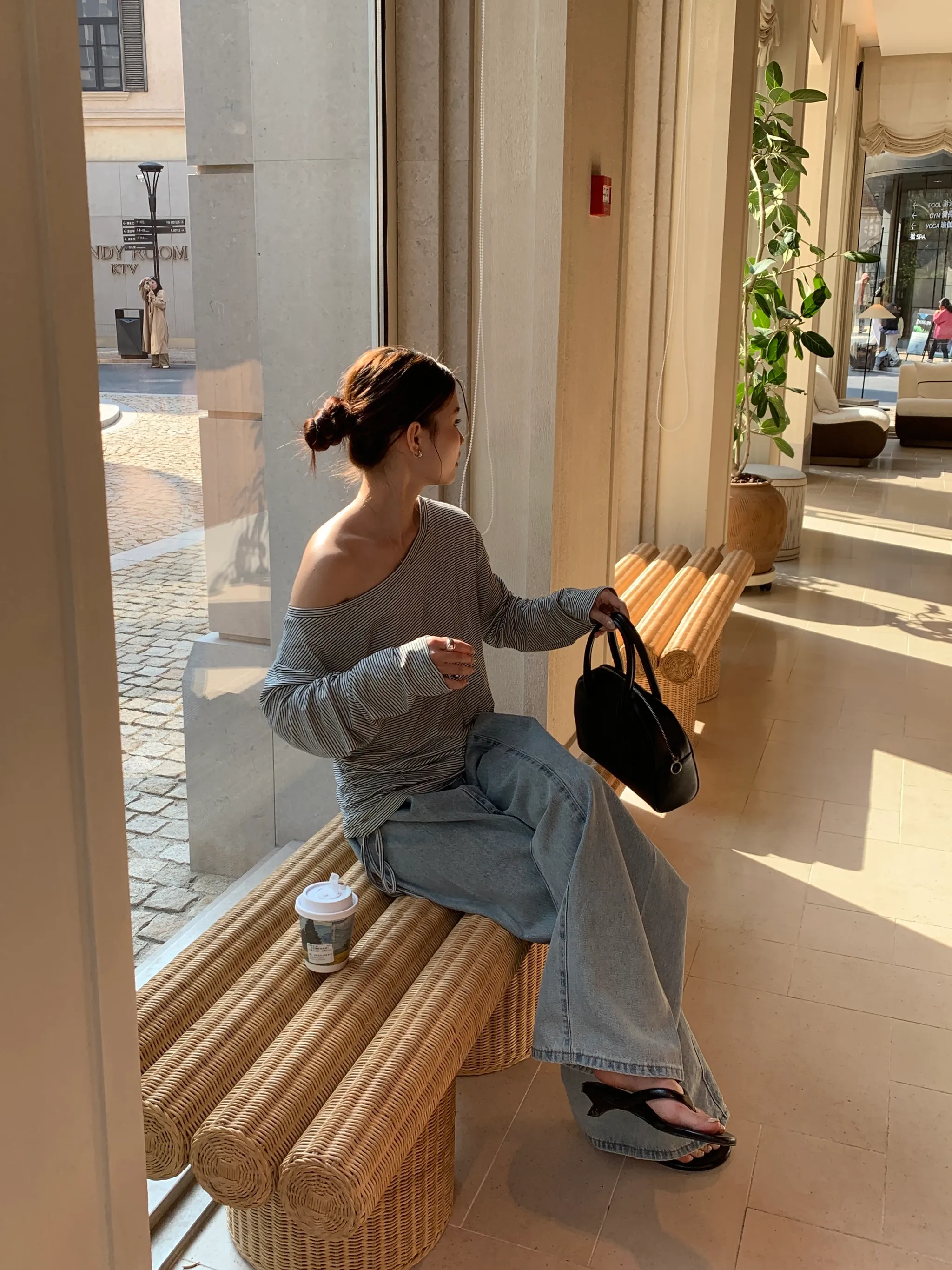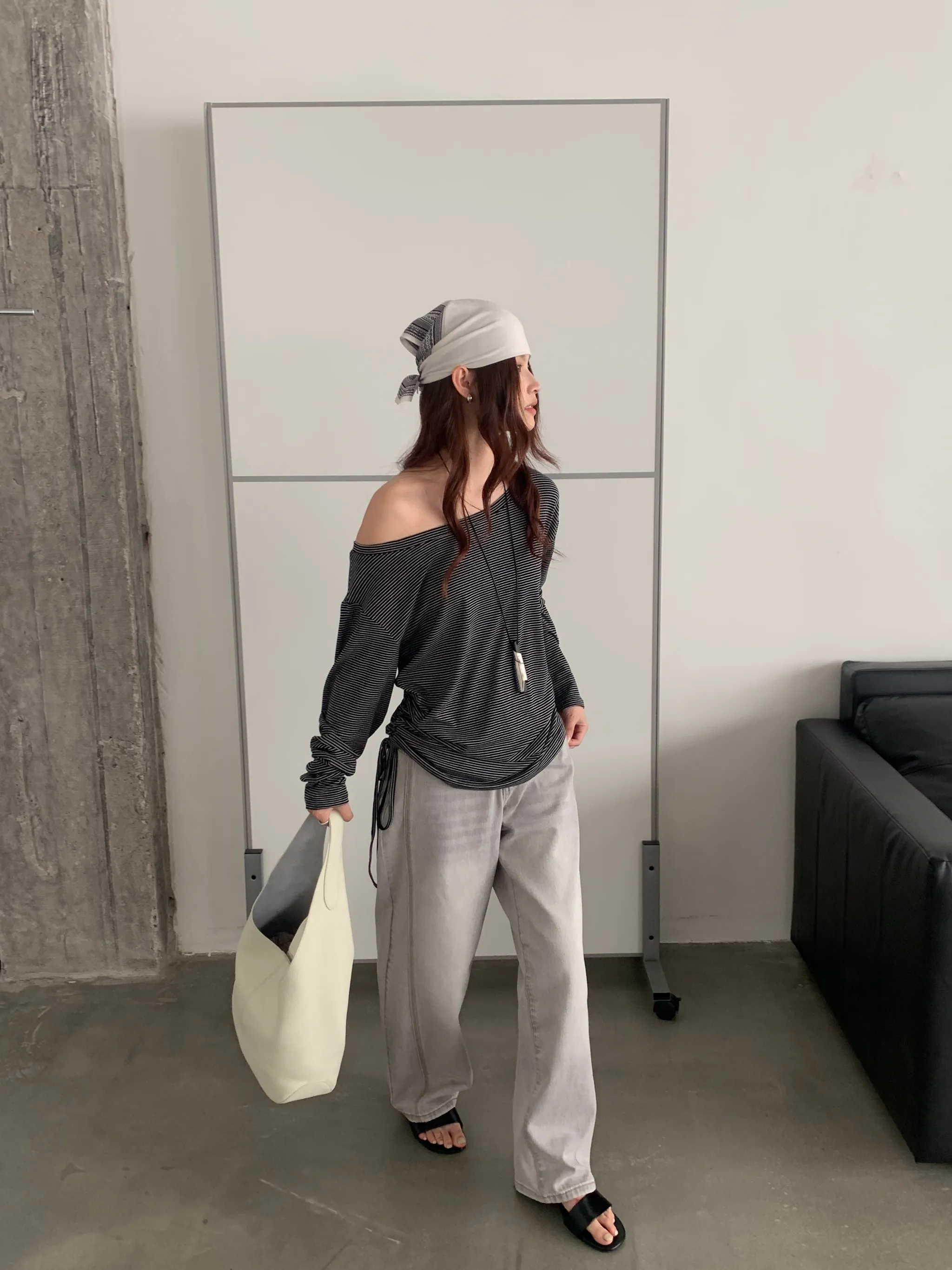 斜肩側抓皺條紋上衣