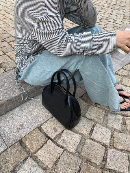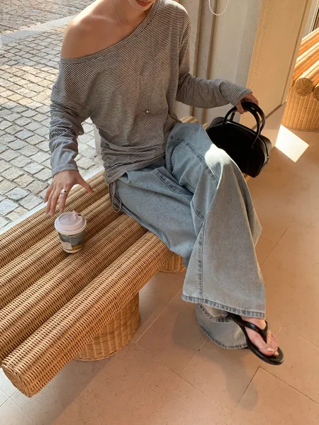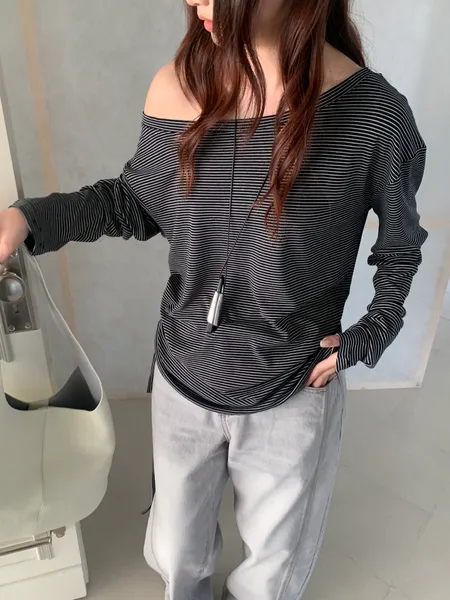 斜肩側抓皺條紋上衣
