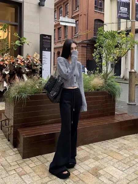 刷絨綁帶抽繩微喇叭激瘦長褲