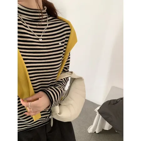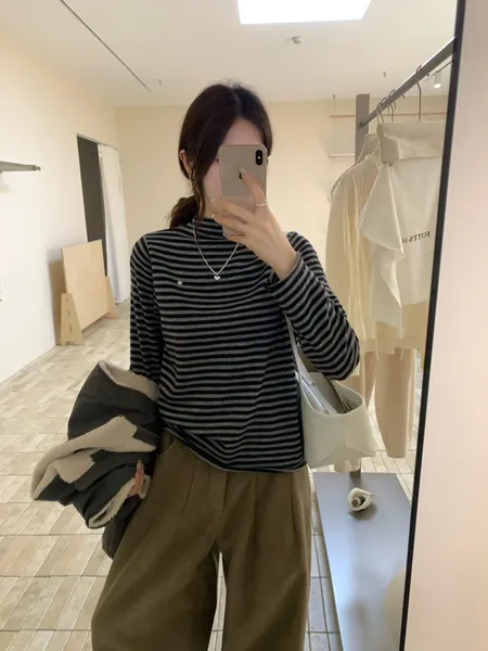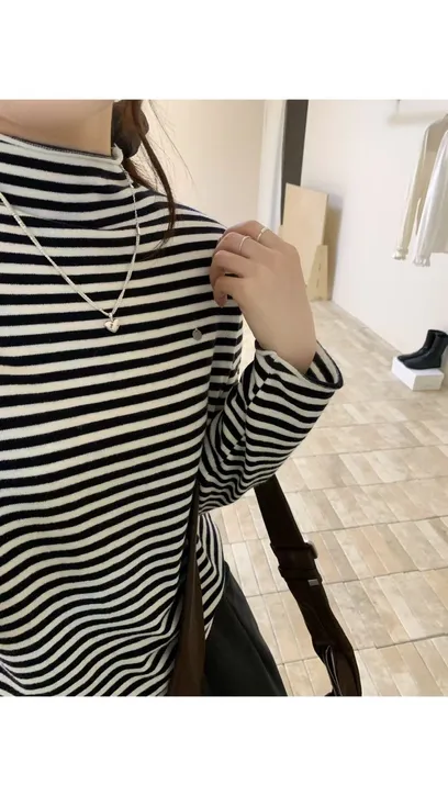 立領捲邊條紋內搭上衣