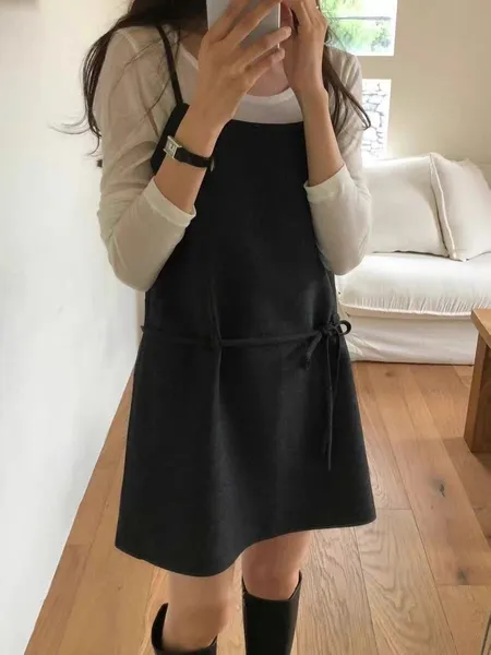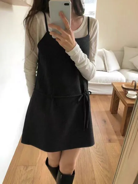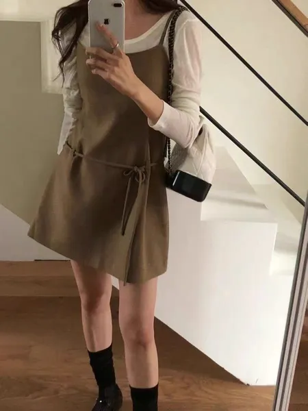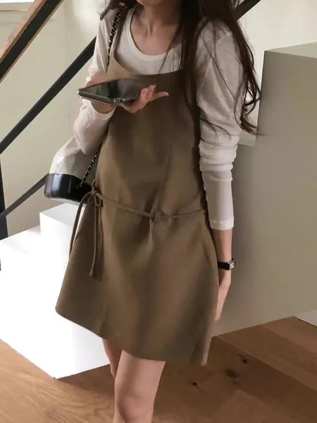 綁帶傘擺短洋裝(肩帶可調)
