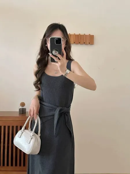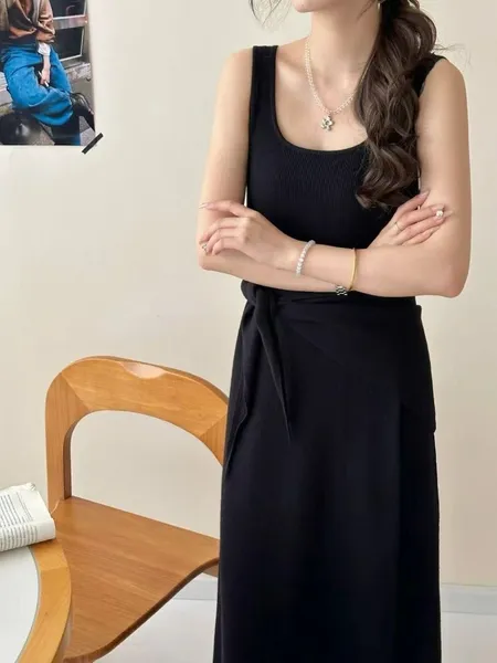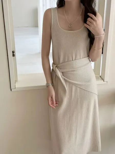 坑條U領背心洋裝(附領巾)